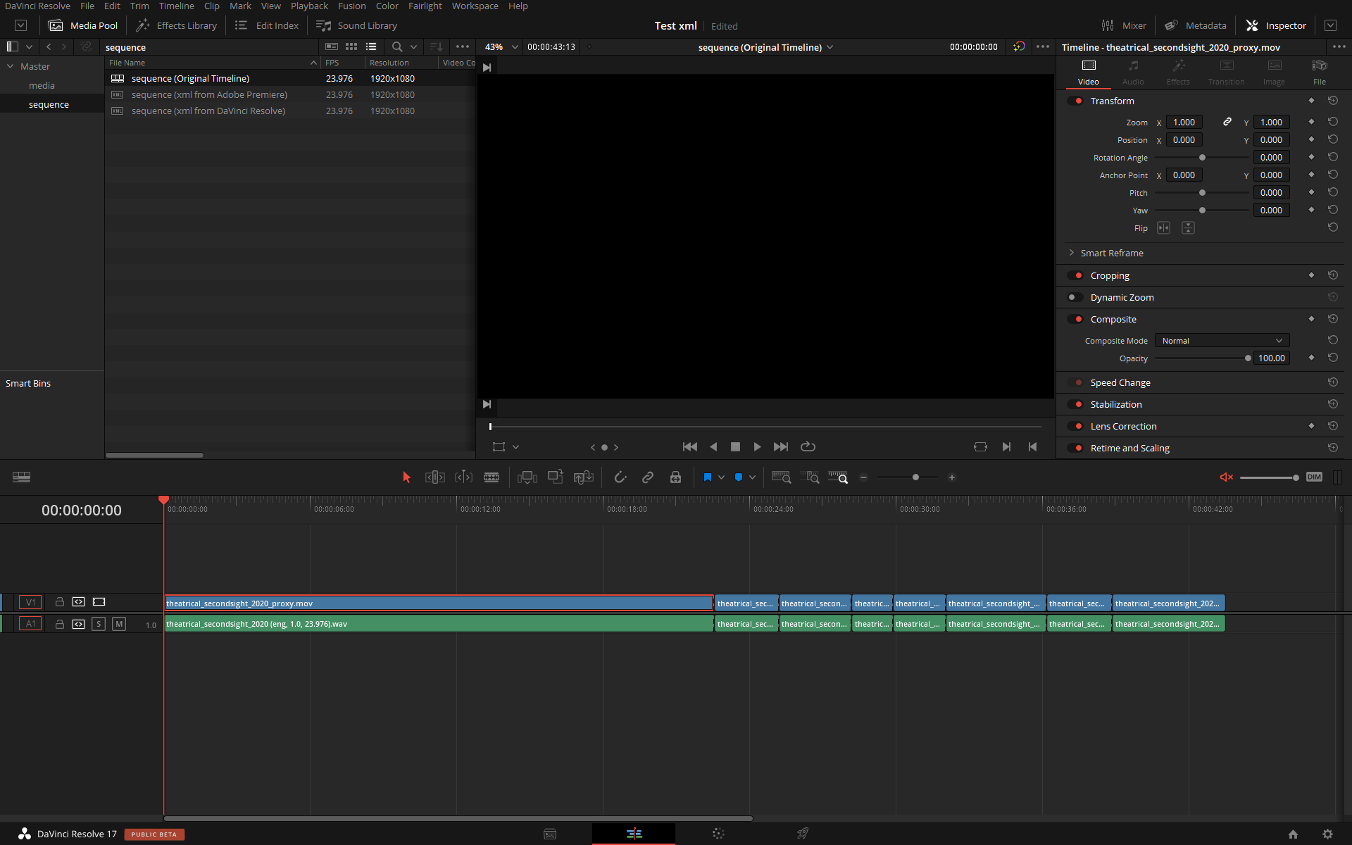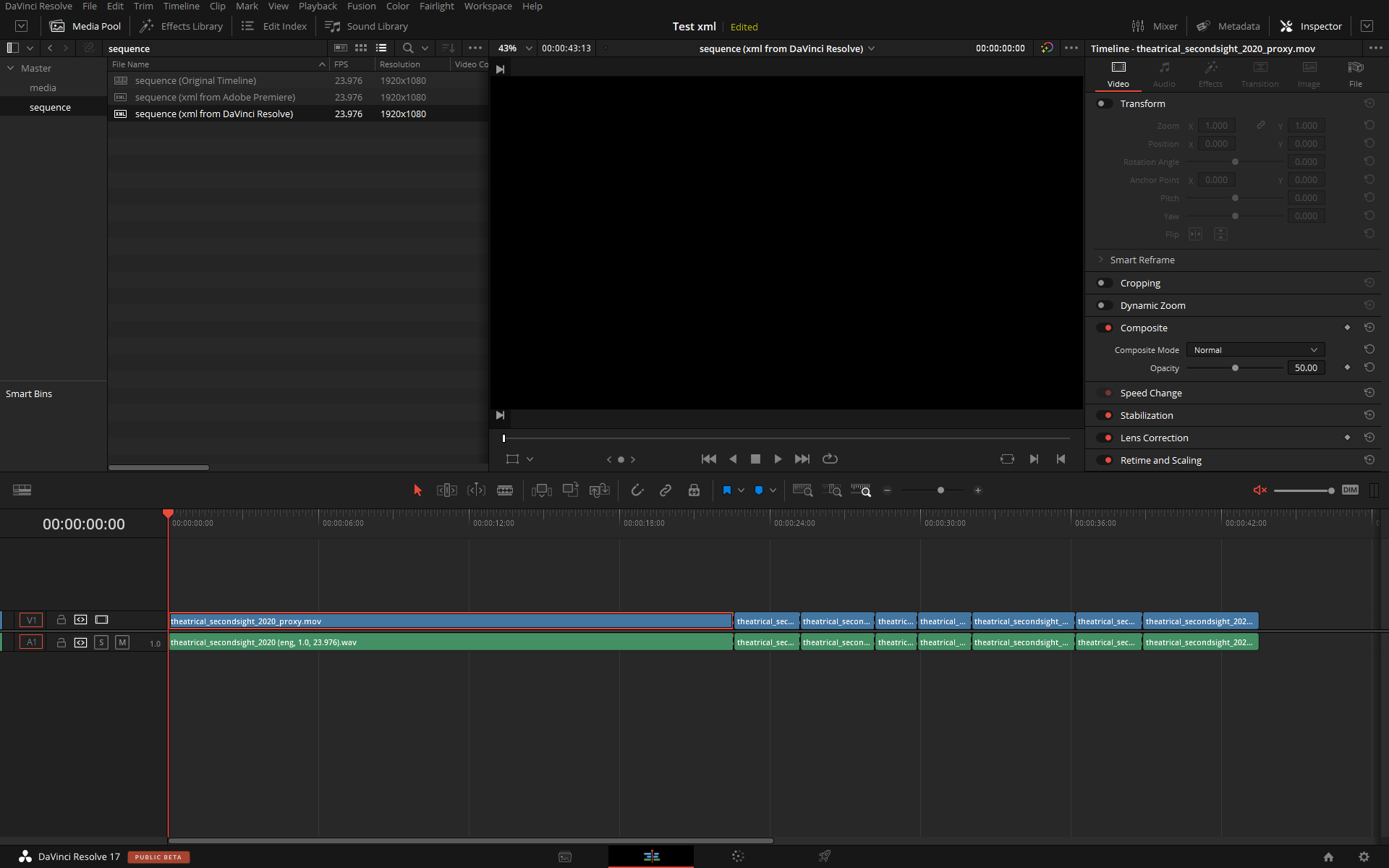 Here's the same edit done in Adobe Premiere, exported as an XML and imported in Resolve: